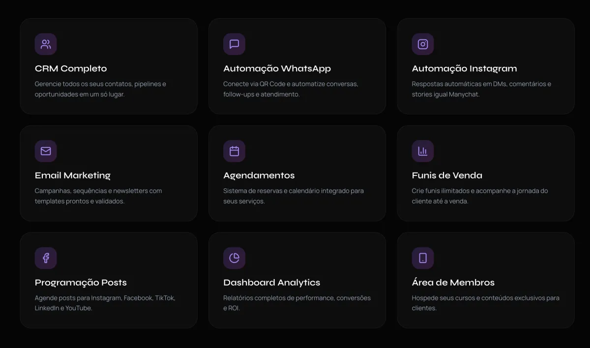 O FlowHub CRM é uma plataforma completa de automação comercial que reúne CRM, marketing, vendas e atendimento em um só lugar. Baseado em GoHighLevel, oferece todas as ferramentas que você precisa para transformar leads em clientes.