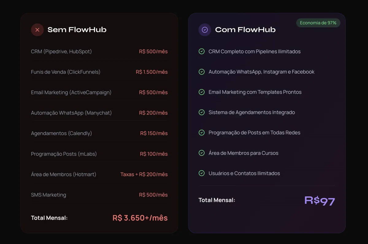 O FlowHub substitui ferramentas como Pipedrive, HubSpot, ActiveCampaign, ClickFunnels, Manychat, Calendly, mLabs, entre outras. Você economiza até R$3.000+/mês usando apenas nossa plataforma.